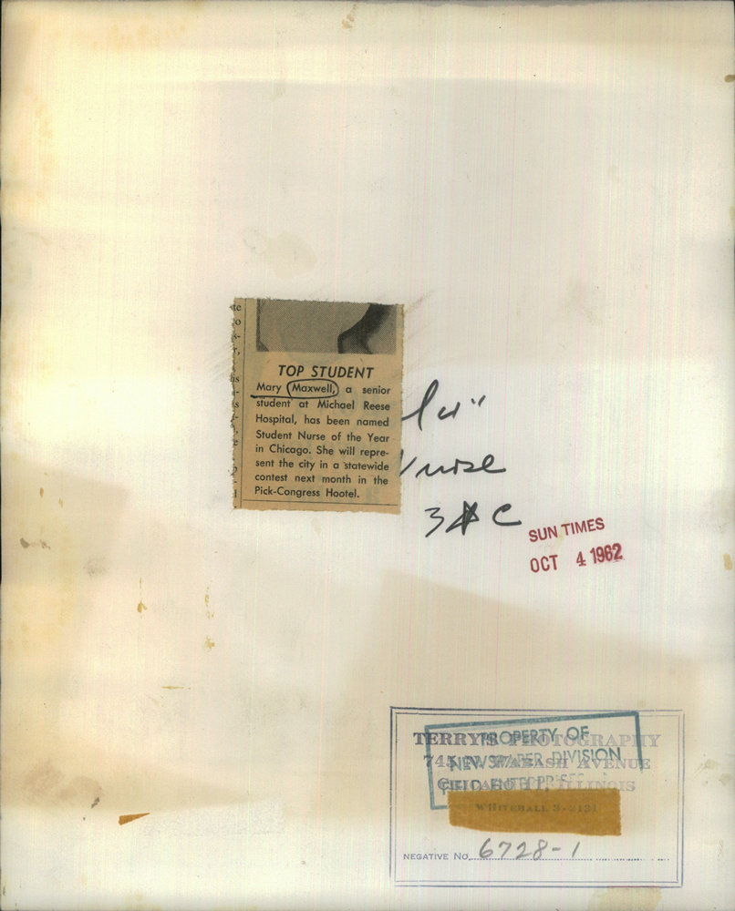 Mary Maxwell, a senior student at Michael Reese Hospital, named Student Nurse of the Year in Chicago.