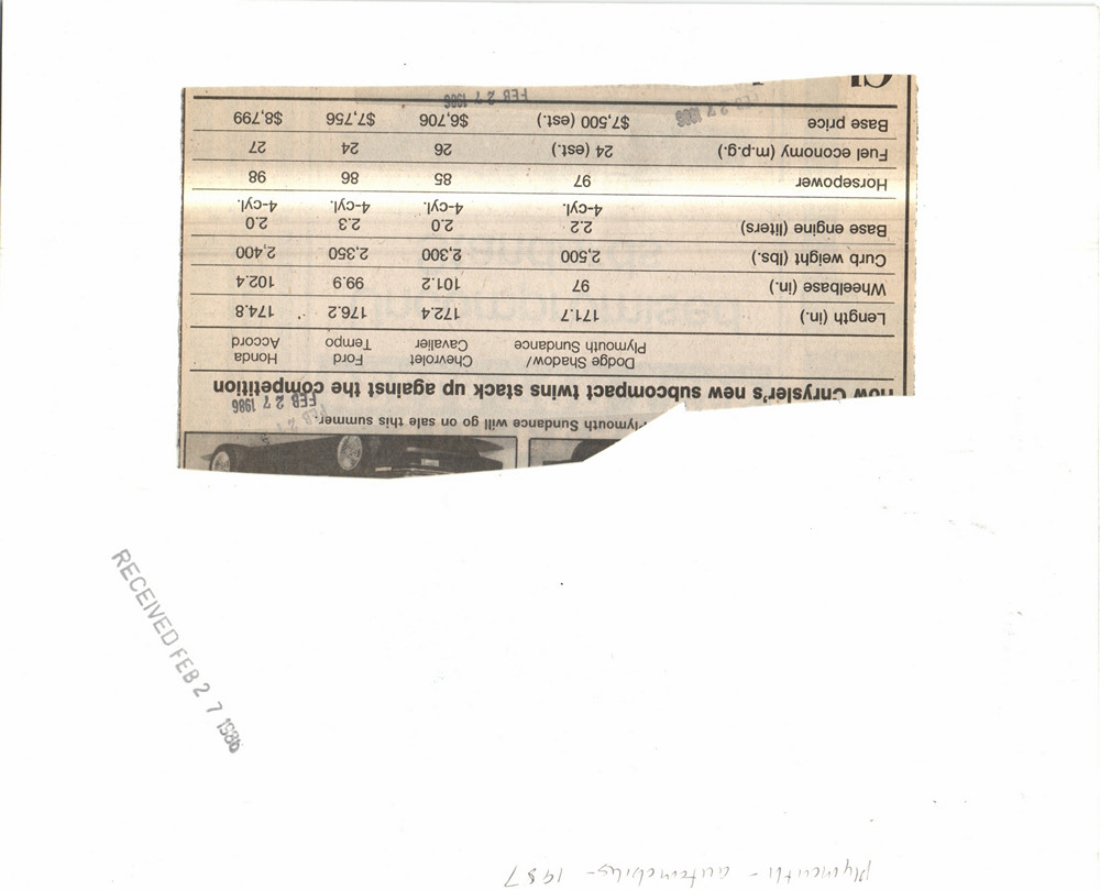 1986 Press Photo 1987 Plymouth Sundance Liftback 4-door