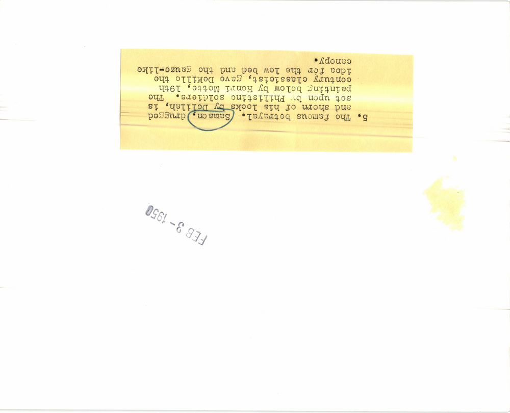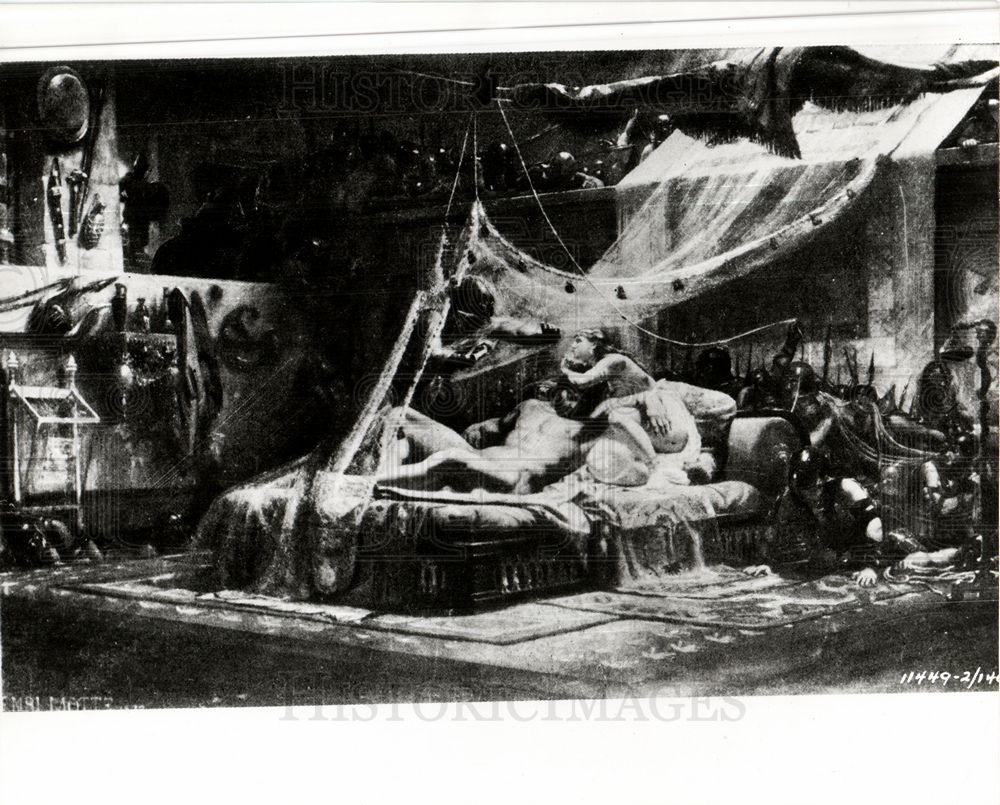 Caption: SamsonThe famous betrayal. Samson, drugged and shorn of his licks by Delilah, is set upon by Philistine soldiers. The painting below by Henri Motte,19th century classicist, gave DoMillo the idea for the low bed and the gauze-like canopy.