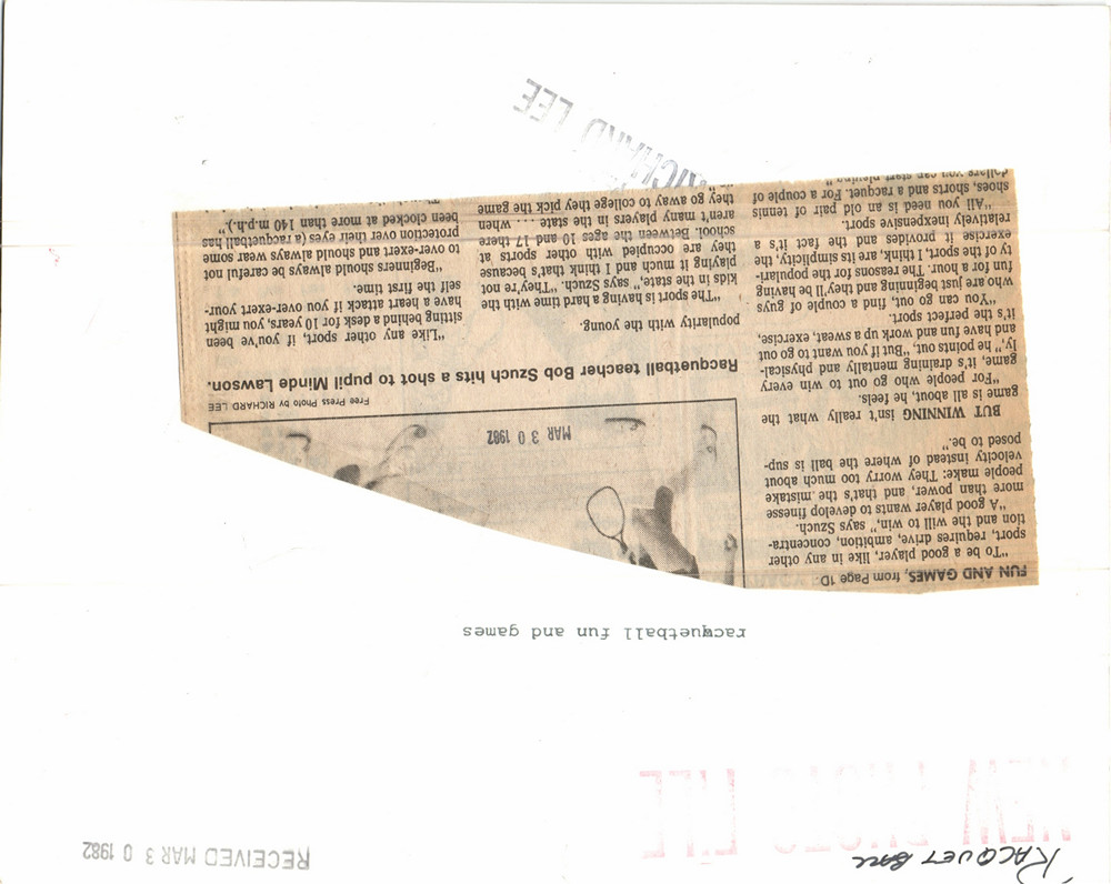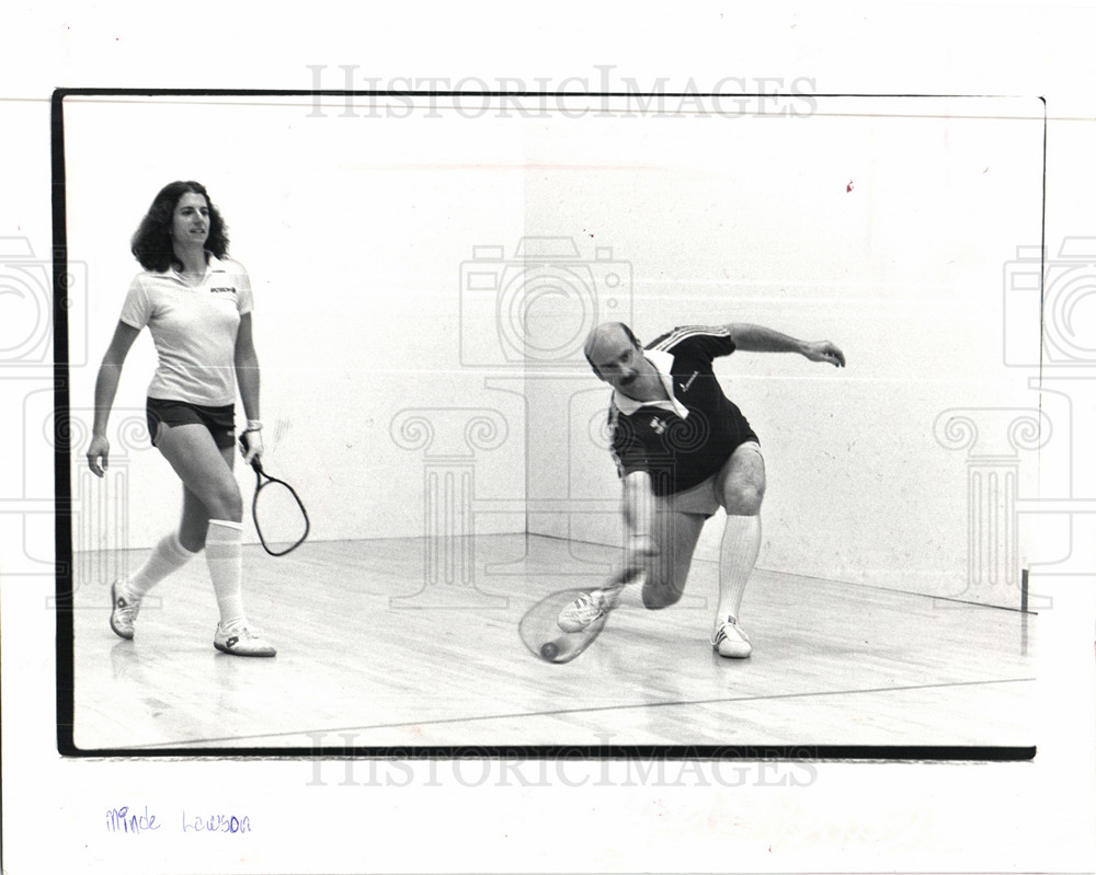 Caption: Racquetball teacher Bob Szuch hits a shot to pupil Minde Lawson.