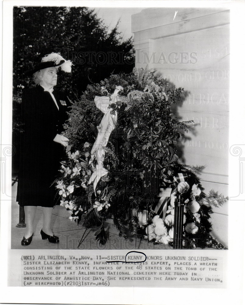 Caption: Sister Kenny Honors Unknown Soldier: Sister Elizabeth Kenny, infantile paralysis expert, places a wreath consisting of the state flowers of the 48 states on the Tomb of the Unknown Soldier in observance of Armistice Day.