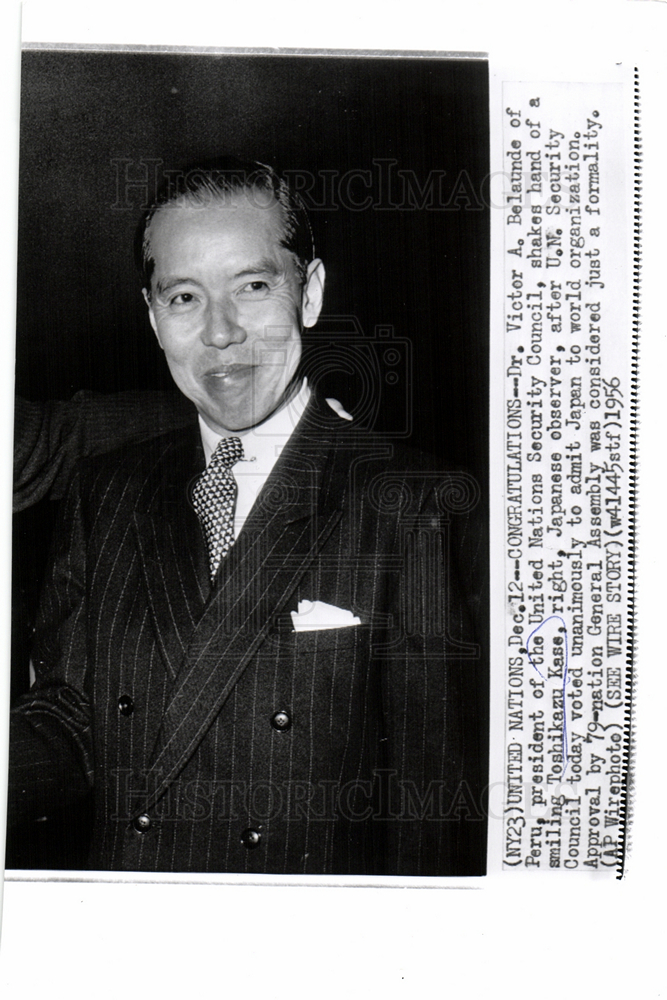 Caption: (NY23)UNITED NATIONS, Dec.12--CONGRATULATIONS-- Dr. Victor A. Belaunde of Peru, president of the United Nations Security Council, shakes hands of a smiling Toshikazu Kase, right, Japanese observer, after U.N. Security Council today voted unanimously to admit Japan to world organization. Approval by 79-nation General Assembly was considered just a formality. (AP Wirephoto)(SEE WIRE STORY)(w41445stf)1956.