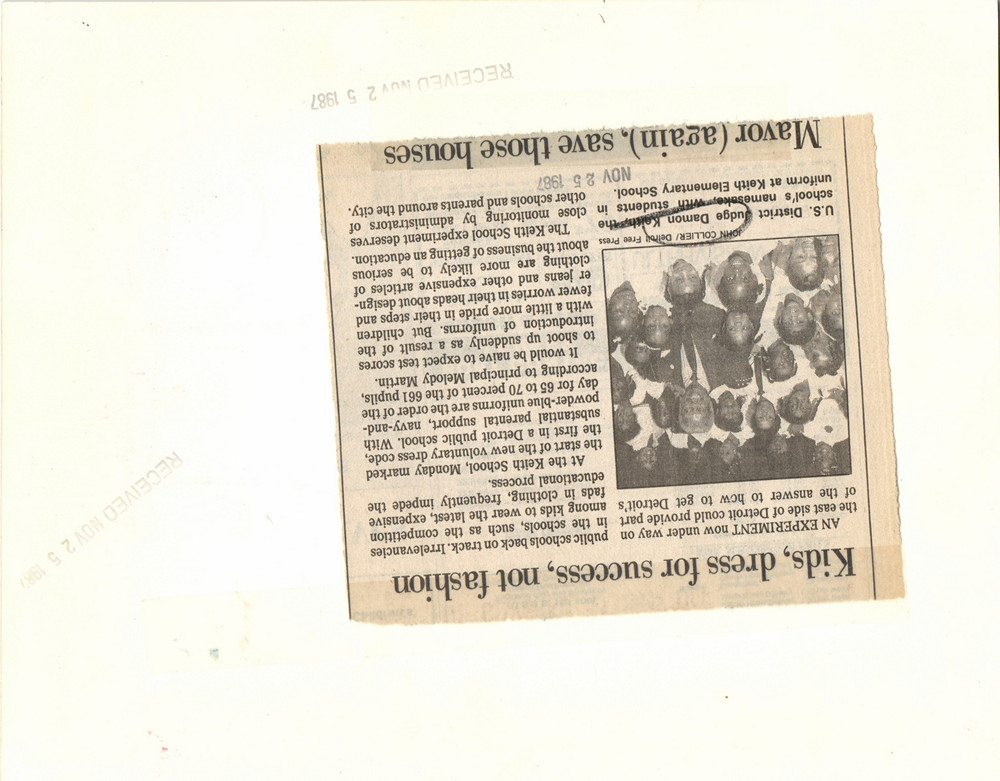 Caption: U.S. District Judge Damon Keith, the school's namesake, with students in uniform at Keith Elementary School.