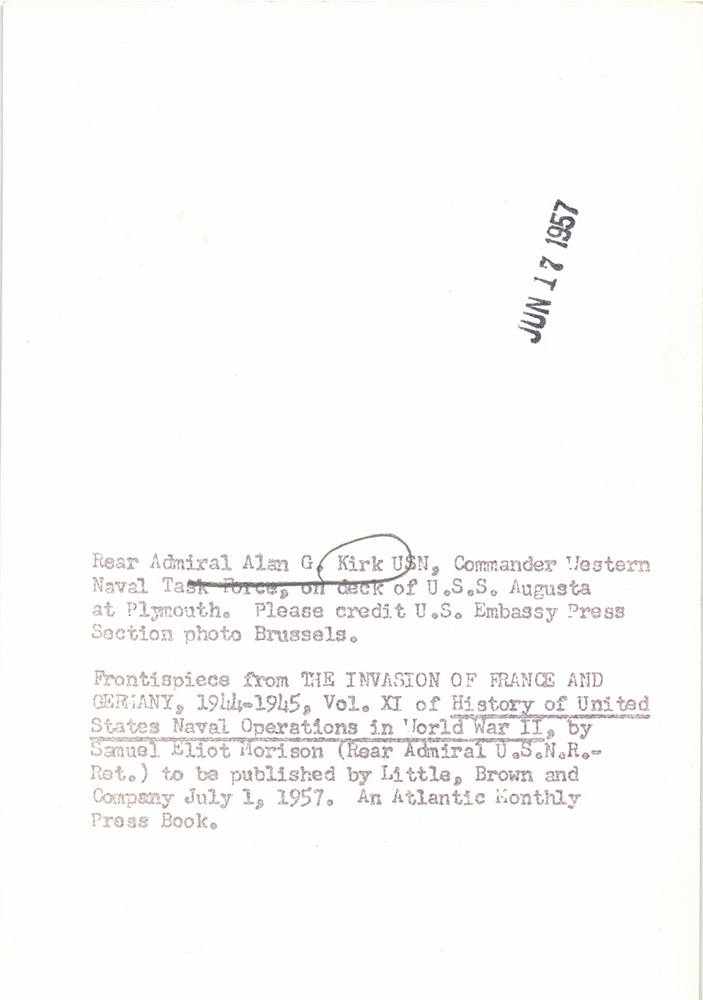 Caption: Rear Admiral Alan G. Kirk, USN, Commander Western Naval Task Force, on deck of USS Augusta at Plymouth. Please credit US Embassy Press Section photo Brussels.