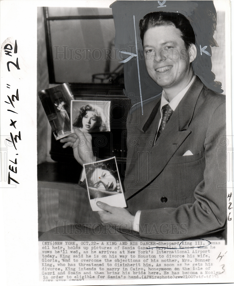 Caption: Sheppard King III, Texas oil heir, hold up pictures of Sania Gamal, Egyptian dancer whom he vows he'll wed, as he arrives at New York's International Airport today. King said he is on his way to Houston to divorce his wife, Gloria, and to overcome the objections of his mother, Mrs. Bonner King, who has threatened to disinherit him. As soon as he gets his divorce, King intends to marry in Cairo, honeymoon on the Isle of Capri and Spain and then bring his bride here. He has become a Moslem in order to be eligible for Sania's hand.