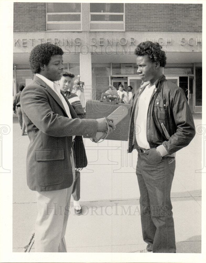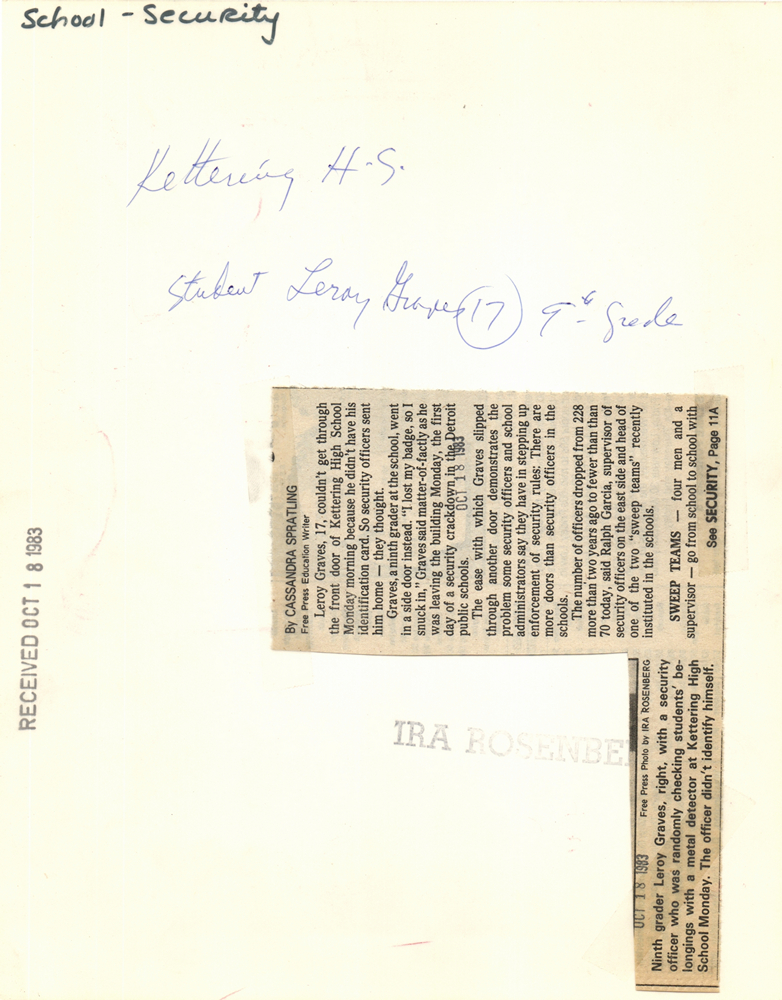 Caption: School - Security: Kettering H.S. Student Leroy Graves, 17, 9th grade Ninth grader Leroy Graves, right, with a security officer who was randomly checking students' belongings with a metal detector at Kettering High School Monday. The officer didn't identify himself. Leroy Graves, 17, couldn't get through the front door of Kettering High School Monday morning because he didn't have his identification card. So security officers sent him home -- they thought. Graves, a ninth grader at the school, went in a side door instead. "I lost my badge, so I snuck in," Graves said matter-of-factly as he was leaving the building Monday, the first day of a security crackdown in the Detroit public schools. The ease with which Graves slipped through another door demonstrates the problem some security officers and school administrators say they have in stepping up enforcement of security rules: There are more doors than security officers in the schools. The number of officers dropped from 228 more than two years ago to fewer than than 70 today, said Ralph Garcia, supervisor of security officers on the east side and head of one of the two "sweep teams" recently instituted in the schools.