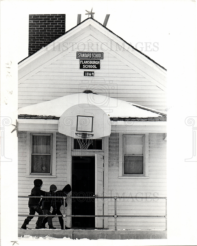 Caption: Boys entering Flansburgh one room schoolhouse built in 1869.