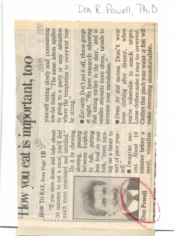 Caption: How you eat is important, too "If you slow down and take about 30 minutes to eat a meal, you'll feel much more nourished and satisfied." Do it by chewing slowing, pausing between forkfuls to talk, putting less food on your fork, "even turning on a timer to sort of peace yourself.".