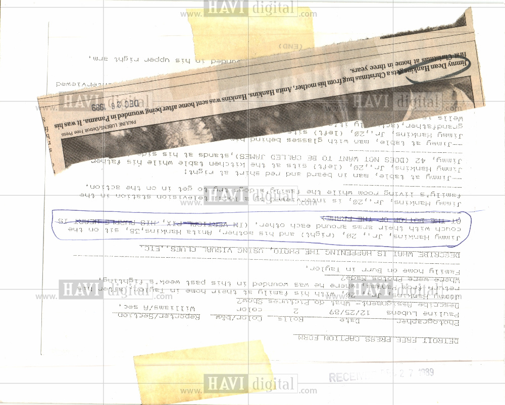 Caption: Jimmy Dean Hankins gets a Christmas hug from his mother, Anita Hankins. Hankins was sent home after being wounded in Panama. It was his first Christmas at home in three years.