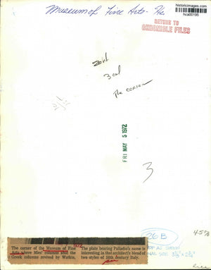 The corner of the Museum of Fine Arts where Mies' columns about the Greek columns revived by Watkin. The plate bearing Palladio's name is interesting in that architects blend of two styles of 16th century Italy.