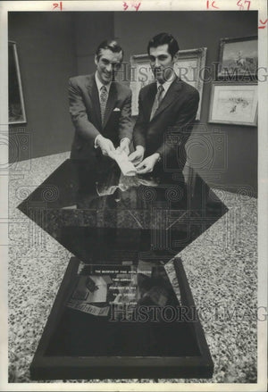 The Museum of Fine Arts' time capsule to be opened 2000 AD receives an artificial art valve from left Board President Alexander McLanahan and Director Philippe de Montebello.