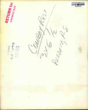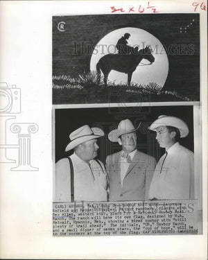 Lawrence Enfield and Kenneth Staples, Arthur ranchers, discuss with Rex Allen, western star, plans for a National Cowboy Rest Ranch. The ranch will have its own flag, designed by W.A. Metcalf, Hyannis, Nebraska, showing a tired cowboy with "still plenty of trail ahead." The initials, "CR", Cowboy Ranch, and a small dipper of seven stars, the "cup of hope," will be in the corners at the top of the flag.