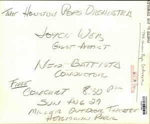 Houston Pops Orchestra, Guest Artist, Joyce Web, and conductor Ned Battista Free concert 8:30 pm Sunday August 29 Miller Outdoor theater Hermann Park