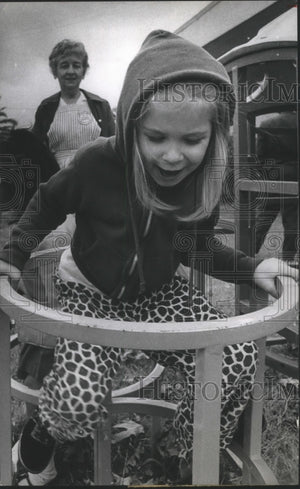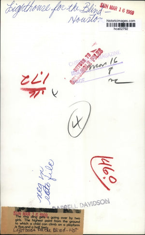 The ring ding gets a going over by two girls. The highest point from the ground to which a child can climb on a playform is five and a half feet. Lighthouse for the Blind, Houston
