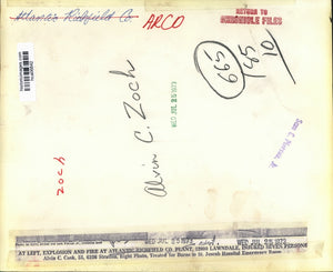 Arco Alvin C. Cook At left (another photo), explosion and fire at Atlantic Richfield Co. Plant, 12000 Lawndale, Injured Seven Person Alvin C Cook, 55, 6326 Stratton, Right Photo, Treated for Burns in St. Joseph Hospital Emergency Room.