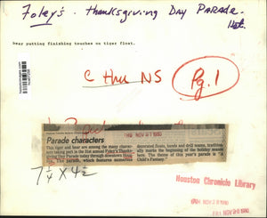 This tiger and bear are among the many characters taking part in the 31st annual Foley's Thanksgiving Day Parade today through downtown Houston. The parade, which features numerous decorated floats, bands and drill teams, traditionally marks the beginning of the holiday season here. The theme of this year's parade is "A Child's Fantasy." Bear putting finishing touches on tiger float.