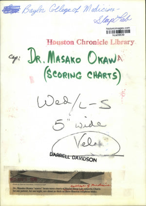 Baylor College of Medicine, Sleep Lab Scoring Charts Dr. Masako Okawa "scores" brain wave charts of Baylor Sleep Lab subjects at College of Medicine. Charts for one patient, for one night, are about as thick as three Houston Telephone Books.