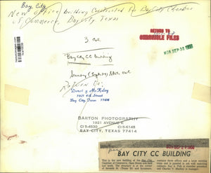 Bay City CC Building This is the new building of the Bay City Chamber of Commerce. Open House was held last week. The structure is at the corner of Seventh St. (Texas 35) and Sycamore, contains three offices and a large meeting room and is paneled in ash with matching cabinets. Roy A. Polk is chamber president and Charles V. Stuckey is manager.
