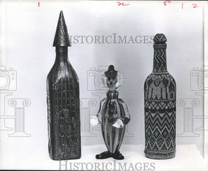 Bottles. Trio of Treasures-From a Greek Island in the Aegean Sea comes a handsome, rich brown, hand-tooled leather liquor bottle, picturing a quaint old character against a stone building, to join the gay clown, made especially for Mrs. Gollan in Venice, and the ancient bottle, origin unknown, in its case of tiny, brilliant beads woven in an intricate Arabic design, another treasure in Gollan collection.