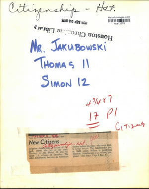 Citizenship - Houston Zbigniew Jakubowski, a native of Poland shares the joy of his sons, Thomas, 11, and Simon, 12, who became U.S. Citizens on Thursday. The elder Jakubowski became an American citizen before his sons, who were born in Great Britain. The Jakubowskis live at 10423 Green Willow in Southwest Houston. Jakubowski is a refinery engineer.