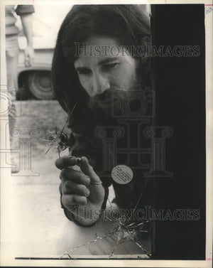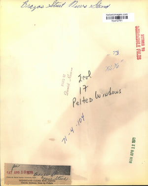 Newsstand clerk Ron Jarvis Checks damage done by pellets Brazos Street News Stand