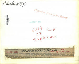 Cleveland, Texas. Explosion Rocks Cleveland, A tank truck unloading gasoline in Cleveland exploded today, slightly injuring the driver and causing a fire that threatened several large fuel storage tanks. The driver, Jesse Bibbs, 25, of ....Alvin in Houston, was treated for burns on his face and arms. The fire destroyed a warehouse at the Noah Whitener Gulf Oil Corp. distributorship in downtown Cleveland, a town of 7,000 in Liberty County about 40 miles north of Houston, before the flames were extinguished.