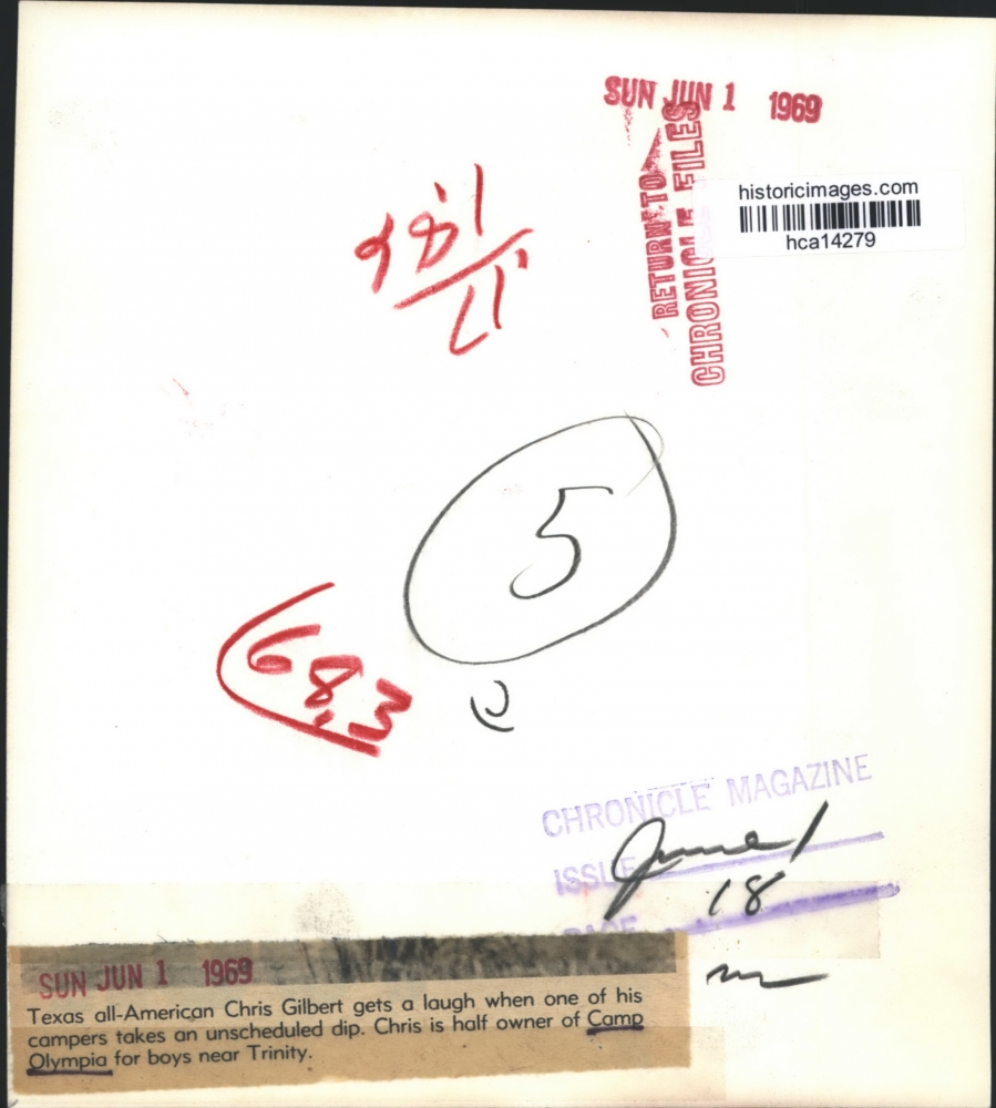 Texas all-American Chris Gilbert gets a laugh when one of his campers takes an unscheduled dip. Chris is half owner of Camp Olympia for boys near Trin…