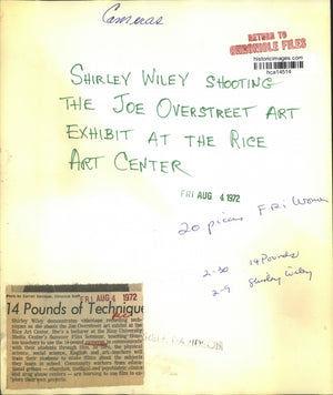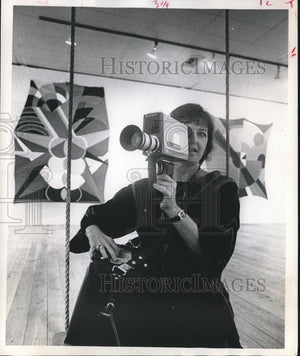 Cameras. Shirley Wiley Shooting The Joe Overstreet art exhibit at the Rice Art Center. She's a lecturer at the Rice University Media Center's Summer Film Seminar, teaching Houston teachers to use the 14-pound cameras to communicate with their students through film. In turn, the physical science, social science, English and art teachers will train their students to make films about the subjects they learn in school. Community workers from educational groups-churches, medical and psychiatric clinics and drug abuse centers-are learning to use film to explore their own projects.