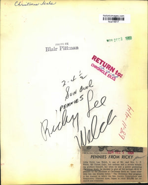 Christmas seals Little Rickie Lee Welch, 6, son of Mr. and Mrs. L. P. Welch, 922 Forest Oaks, has asthma and a severe breathing problems himself, but when he saw a poster promoting Christmas seals, he decided to give all his savings - $3.55 in pennies - to the purchase of Christmas seals so "some other little boy can breathe better." The Christmas seal program is the manner in which the San Jacinto tuberculosis and respiratory diseases association hope to raise $275,000 for research and treatment.