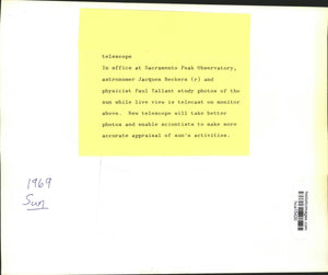 Telescope. In office at Sacramento Peak Observatory, astronomer Jacques Beckers (right) and physicist Paul Tallant study photos of the sun while live view is telecast on monitor above. New telescope will take better photos and enable scientists to make more accurate appraisal of sun's activities.