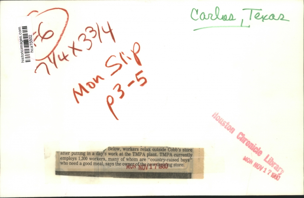 1980 Press Photo Workers Relax Outside Cobb's Store at TMPA Plant in Carlos, TX
