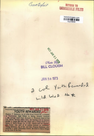 Counterfeit. Youth Rewarded, Stephen P. Mahoney, 14, of 14754 River Forest Dr., a student at Westchester High School in Spring Branch, receives a $50 savings bond from Kenneth J. Wiesman head of the U.S Secret Service office here, for turning over to lawmen $16,800 in bogus $20 bills the youth and a friend found in a bayou at Baton Rouge, Louisiana, in 1971. Agents said the counterfeit money was part of a $1 million printed in Louisiana. Young Mahoney, son of Mr. and Mrs. Francis Mahoney, also received a good citizenship award. He lived in Baton Rouge at the time of the find.