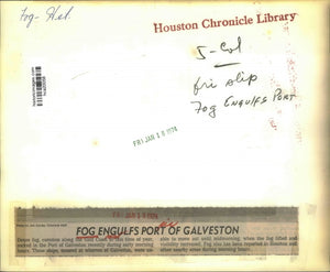 Fog, Houston. Fog Engulfs Port Of Galveston, Dense fog, common along the Gulf Coast at this time of year, socked in the Port of Galveston recently during early morning hours. These ships, moored at wharves at Galveston, were unable to move out until midmorning, when the fog lifted and visibility increased. Fog also has been reported in Houston and other nearby area during morning hours.
