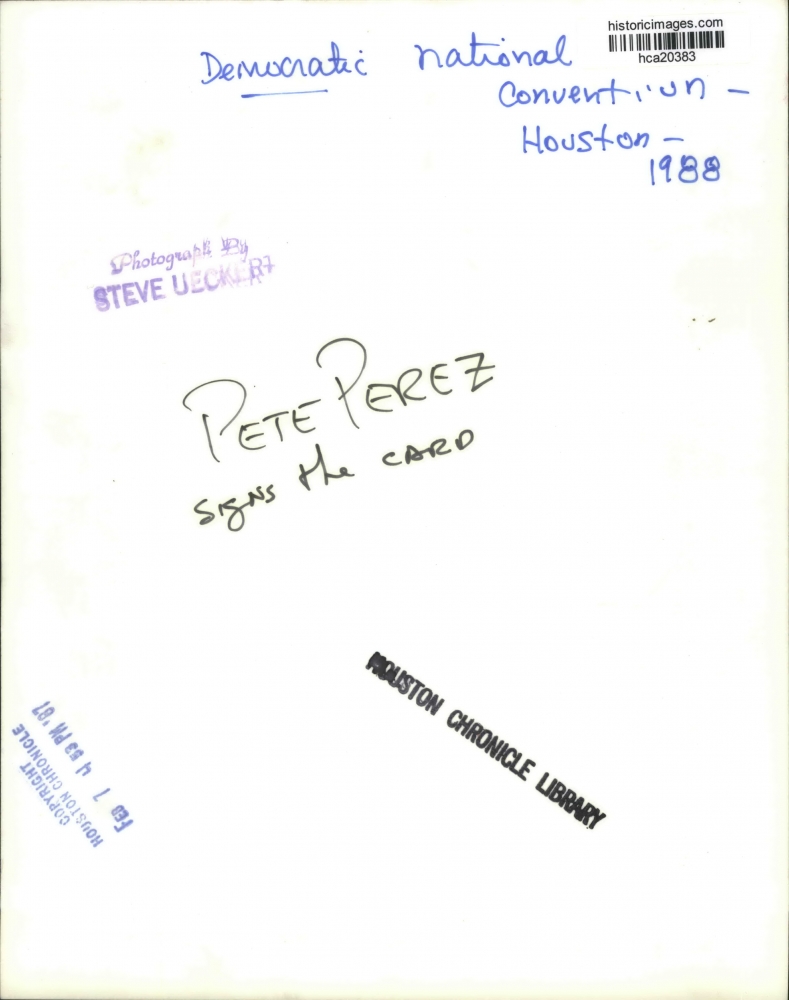 Pete Perez signs the card. Democratic National Convention, Houston 1988.