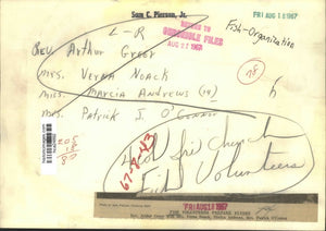 Fish volunteers prepare flyers. Reverend Arthur Greer with Mrs. Verna Noack, Marica Andrews and Mrs. Patirck O'Connor. Fish - Organization.