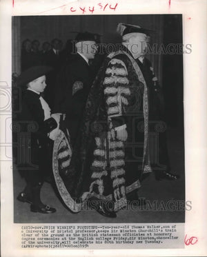 In Winnie's Footsteps -- Ten-year-old Thomas Walker, son of a University of Bristol professor, keeps Sir Winston Churchill's train clear of the ground as the British statesman officiates at honorary degree ceremonies at the English college. Sir Winston, chancellor of the university, will celebrate his 80th birthday next Tuesday.