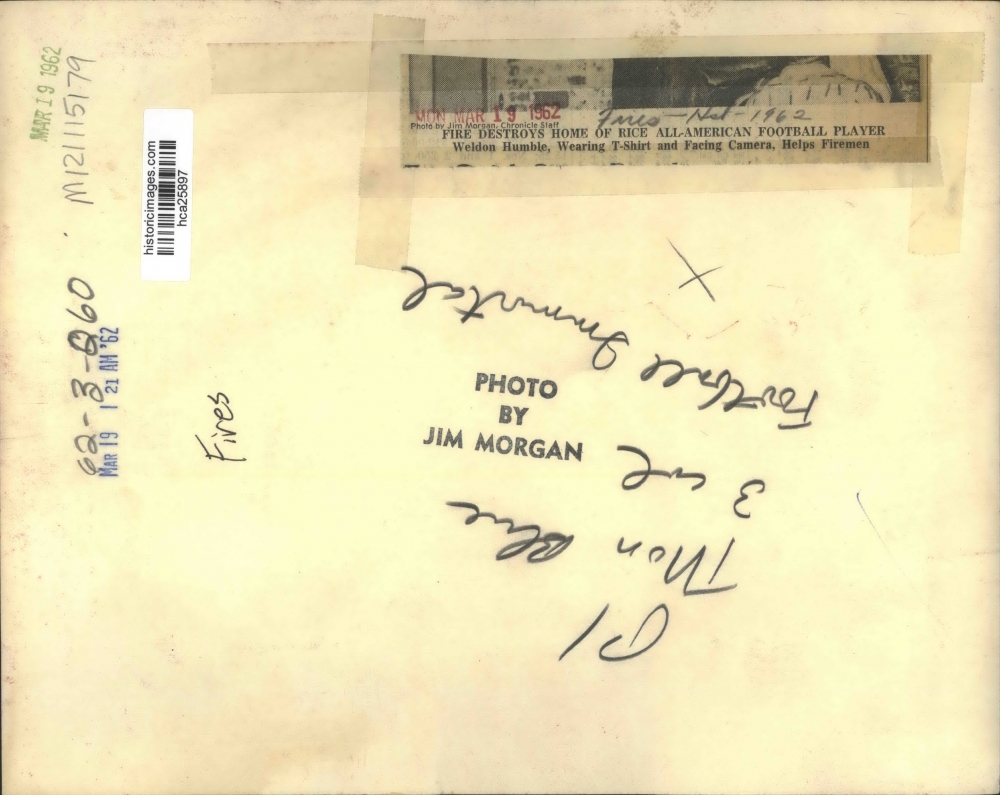 Fire destroys home of Rice All-American football player Weldon Humble, wearing T-shirt and facing camera, helps firemen. Fires - Houston, Texas.