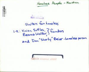 Shelters for homeless. L-R: Vivian Suttles and Roxanna Walker, Founders and Don "Shorty" Rosier - homeless person. Homeless People - Houston, Texas.