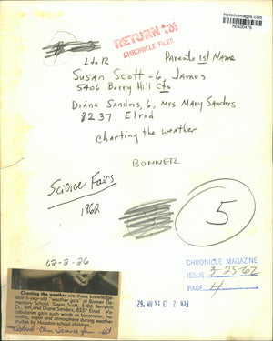 Charting the weather are these knowledgeable 6-year-old "weather gals" at Bonner Elementary School, Susan Scott, 5406 Berryhill Court, left, and Diane Sanders, 8237 Elrod. Vocabularies gain such words as barometer, humidity, vapor and atmosphere during weather studies by Houston school children. Left to right: Susan Scott, 6, James, Diane Sanders, 6, Mrs. Mary Sanders. Schools - Elementary science fair - Houston.