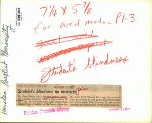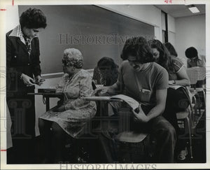 Dr. Muriel Flake, left, a Houston Baptist University assistant professor, hands a tape cassette to Bea Lipp, 73, the university's first totally blind student. Lipp, a resident of the Jewish Home for the Aged, 6425 Chimney Rock, says she wants to learn psychology to help people help themselves. At right is senior Steve Tapscott, 21, one of the students who have helped record course materials. Houston Baptist University.