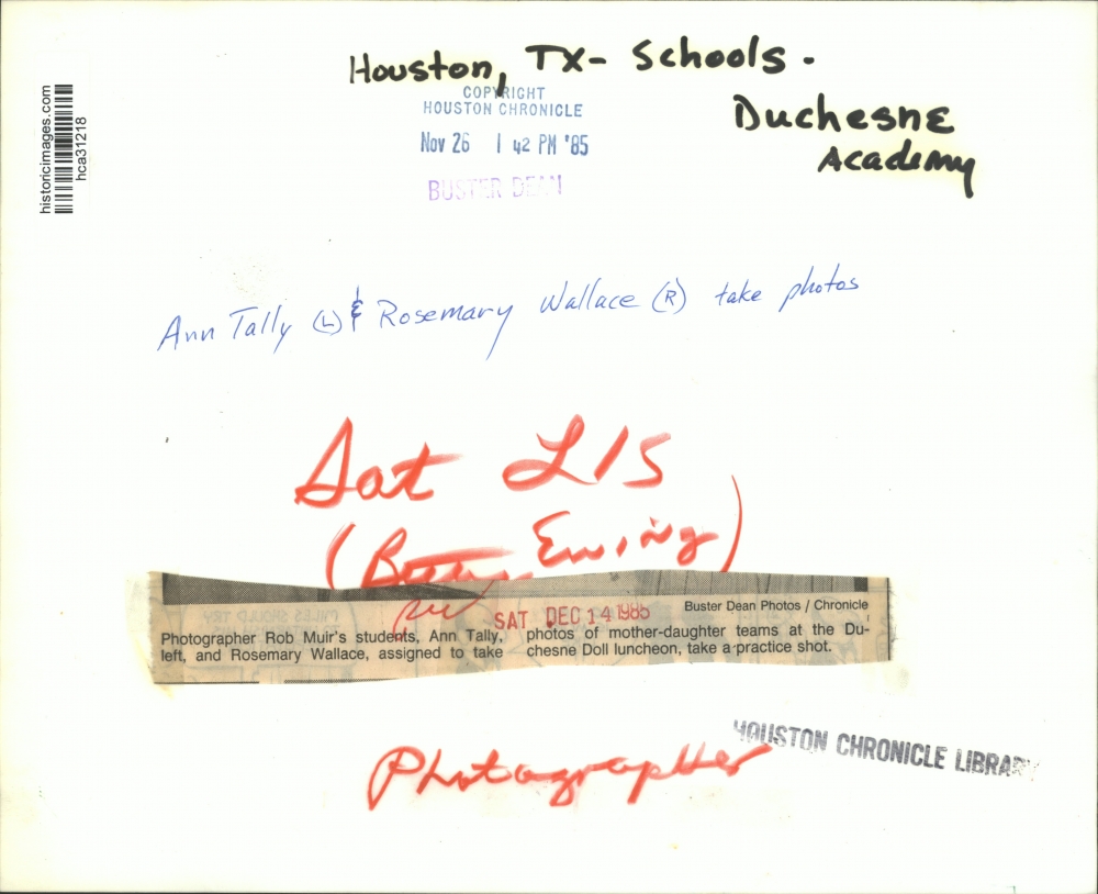 1985 Press Photo Ann Tally & Rosemary Wallace take photos, Duchesne Academy, TX