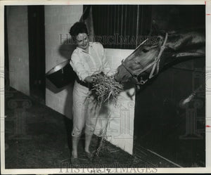 1960 Press Photo Women feeds hay to horse in stall - hca31393