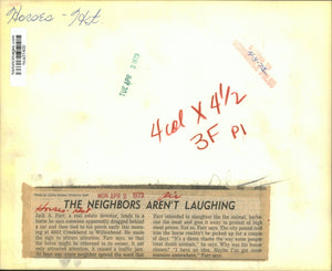 Horses - Houston. Jack A Farr, a real estate investor, tends to a horse he says someone apparently dragged behind a car and then tied to his porch early this morning at 4601 Creekbend in Willowbend. He made the sign to attract attention, Farr says, so that the horse might be returned to its owner. It not only attracted attention, it caused a traffic jam. At least one irate neighbor spread the word that Farr intended to slaughter the animal, barbecue the meat and give it away in protest of high meat prices. Not so, Farr says. The city pound told him the horse couldn't be picked up for a couple of days. "It's a damn shame the way some people treat dumb animals," he says. Why was his house chosen "I have no idea. Maybe I've got some enemies somewhere," Farr says. Horses - Houston.