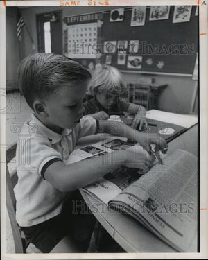 1969 Press Photo Brian O'Neil and Lynn Hallard work in classroom in Houston