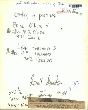 Houston schools - kindergarten. Brian O'Neil, 8014 Carvel, and Lynn Hallard, 7504 Kensico, cut and paste. Many kindergarten activities can be done at home. Cutting and pasting. Brian O'Neil, 5, Mr. and Mrs. M. J. O'Neil. Lynn Hallard, 5, Mr. and Mrs. J. A. Hallard.