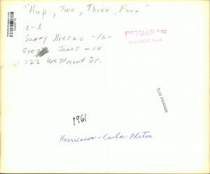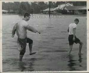 Boys hike through flooded Houston street after Hurricane Carla. "Hup, Two, Three, Four" left to right: Sonny Breszo, 16 and Greg Jones, 14 of 422 Westmont Dr. Hurricanes - Carla - Photos - Houston, Texas