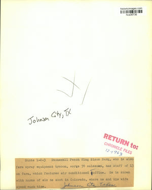 Stonewall Peach King Simon Burg, who is also farm spray equipment tycoon, works 70 salesmen, has staff of 13 on farm, which features air conditioned office. He is shown with horns of elk he shot in Colorado, where he and his wife spend much time. Johnson City, Texas.