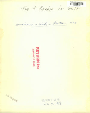 Aerial view of a tug boat and barge in Gulf during winds of Hurricane Cindy. Hurricanes - Cindy - Photos - 1963