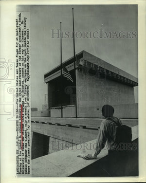 The United States and Texas flags fly at half-staff Tuesday at the Lyndon B. Johnson Library on the first anniversary of the former president's death. University of Texas law student Chris Scruggs, of Houston, pauses on his way to classes. No public ceremony was planned, only a wreath from library employees on the spot inside the library where the former president lay in state.
