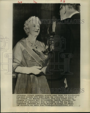 1953 Press Photo Lady Churchill accepts Nobel Prize from King Gustaf in Sweden
